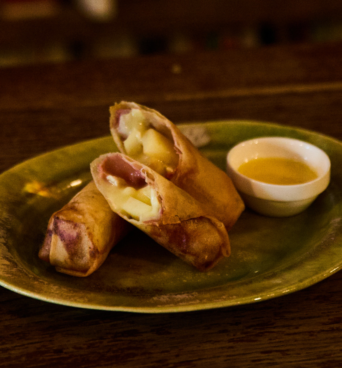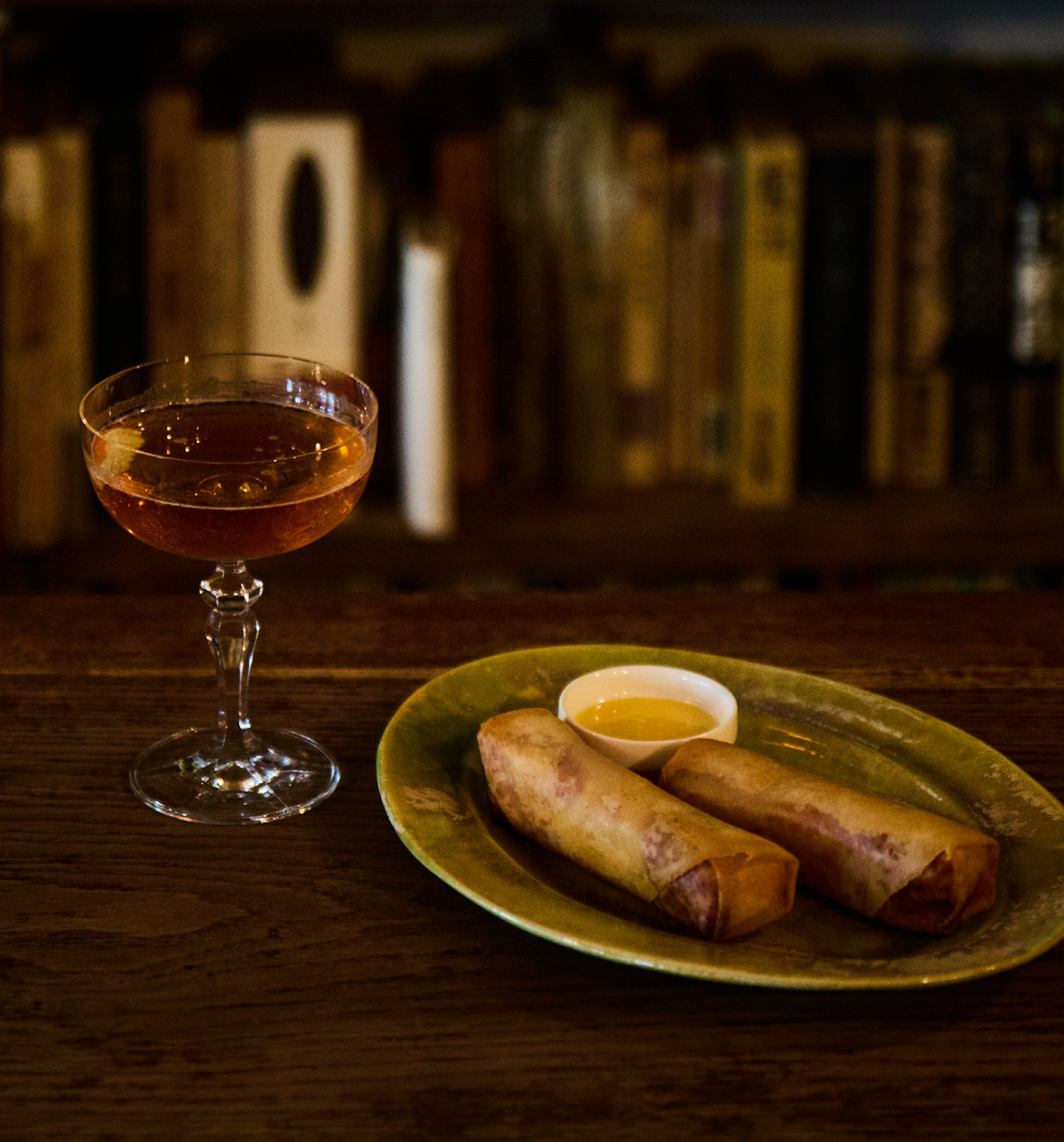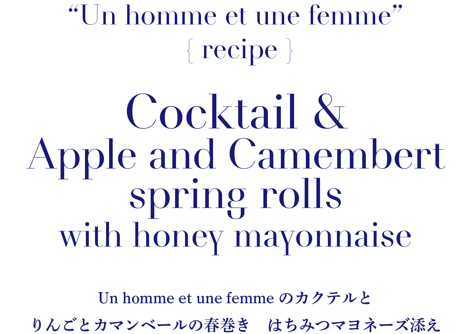 カクテルは“男と女” を象徴するように、男性的なウィスキーと女性的なやや甘口のシードルをシンプルにブレンドしました。香り付けにレモンピールをあしらっています。バリっとした皮と加熱したりんごの食感、溶けたチーズのまろやかさが楽しい春巻きは、はちみつを加えたマヨネーズをつけるとさらにおいしいですよ」(紺野)