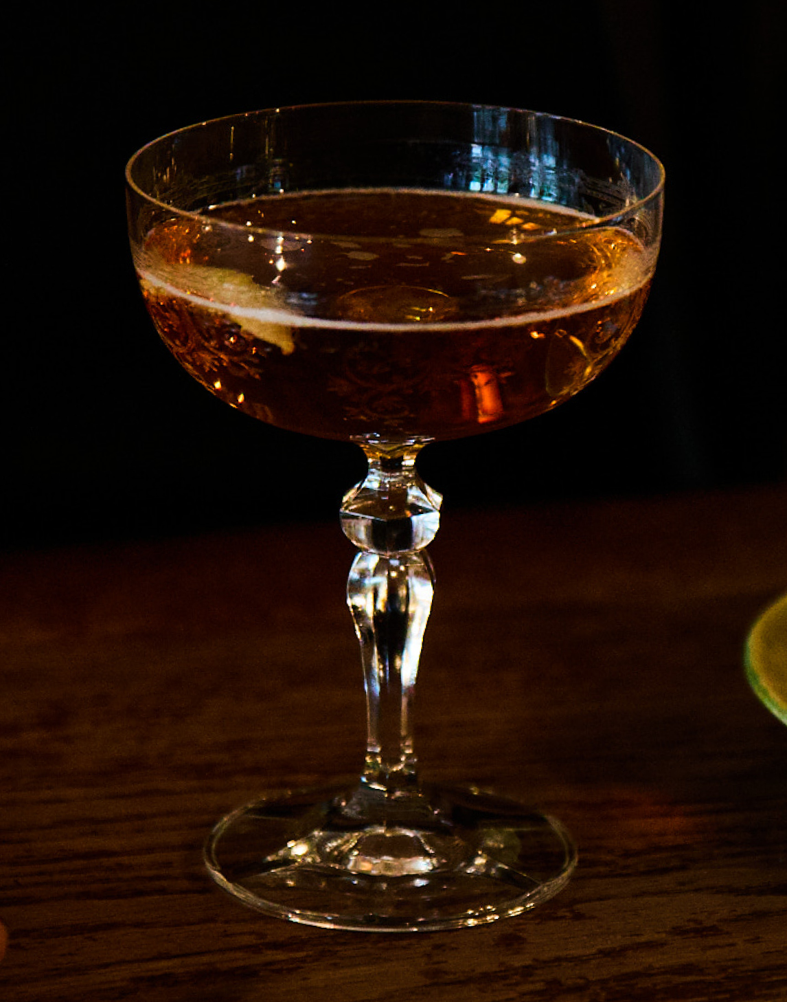 2 グラスにウィスキーを注ぎ、シードルを静かに注ぎ入れる。レモンピールをのせる。