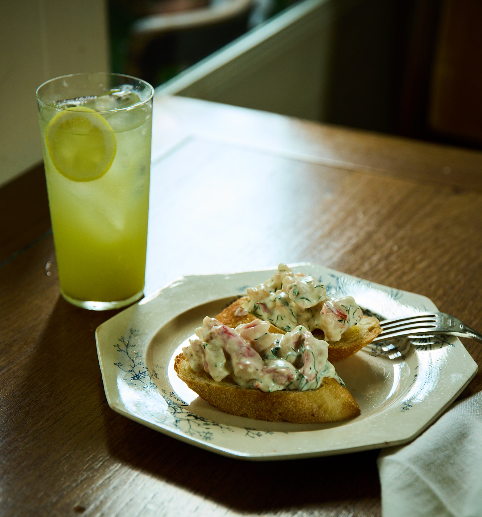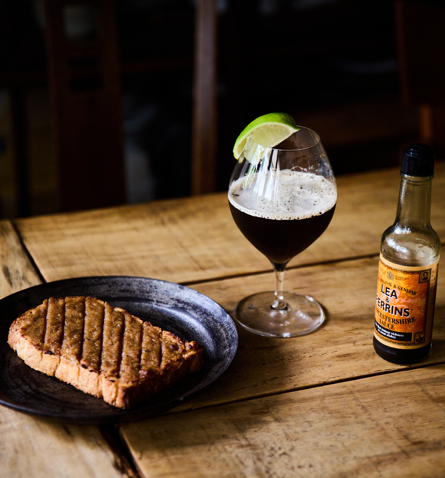 「イギリスのトラディショナルな料理で、うさぎ肉の代用として発案されたという説もあるんですよ。日本ではなかなかお目にかかれないトーストですが、僕流においしく仕上げています。ちゃんと作ると手間がかかりますが、今回は一つのフライパンでできるようにアレンジ。ペーストは冷蔵庫で1 週間ほど保存できます。カクテルは、ペーストの味付けに使うギネスビールをベースに、りんごジュースとラム酒を組み合わせました。とても飲みやすいので、黒ビールが苦手な方にも喜んでいただけるはず」(紺野)