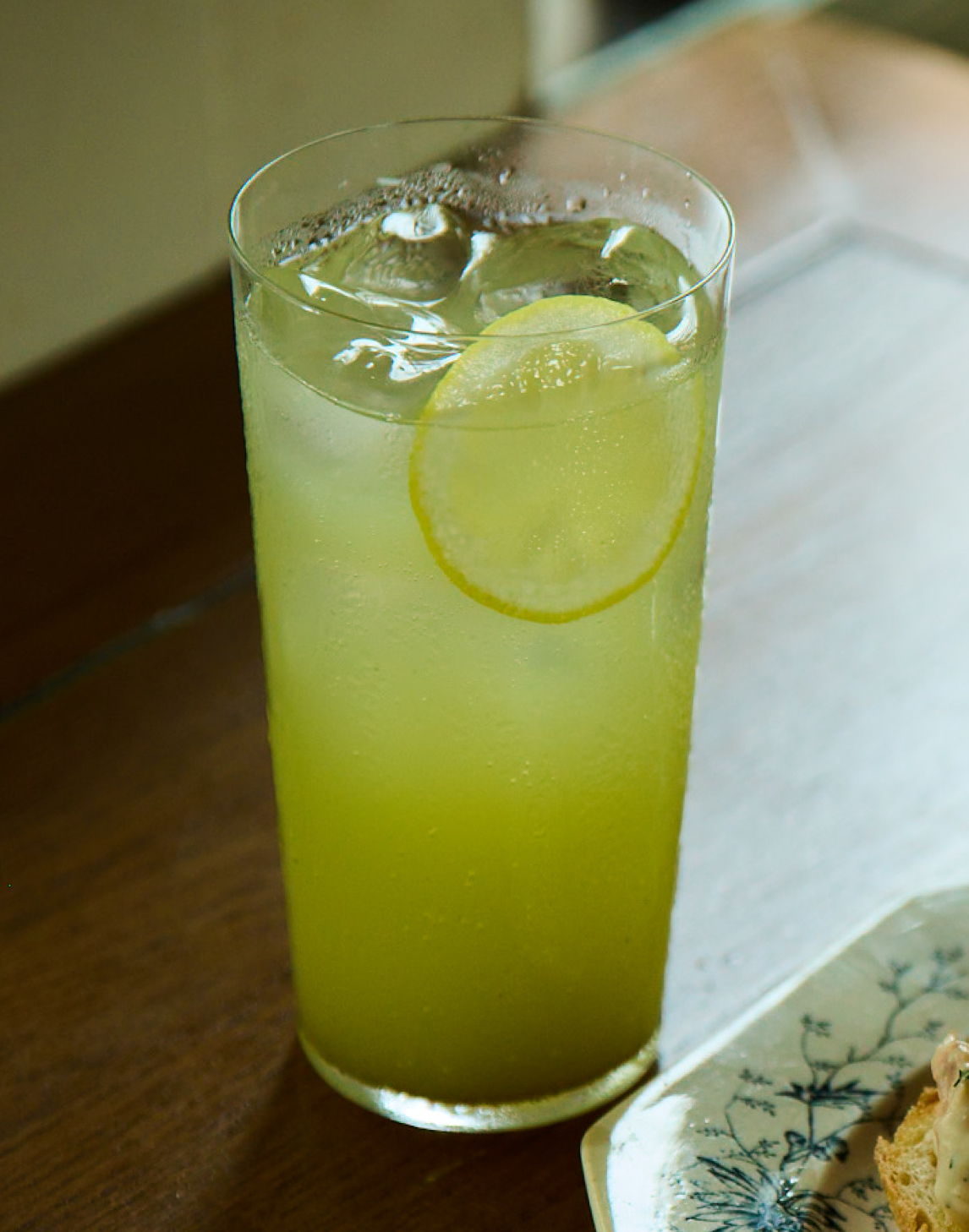 ② グラスに氷を入れ、ジン、1 のシロップ、ソーダを加えてステア(手早くかき混ぜる)し、レモンスライスを飾る。