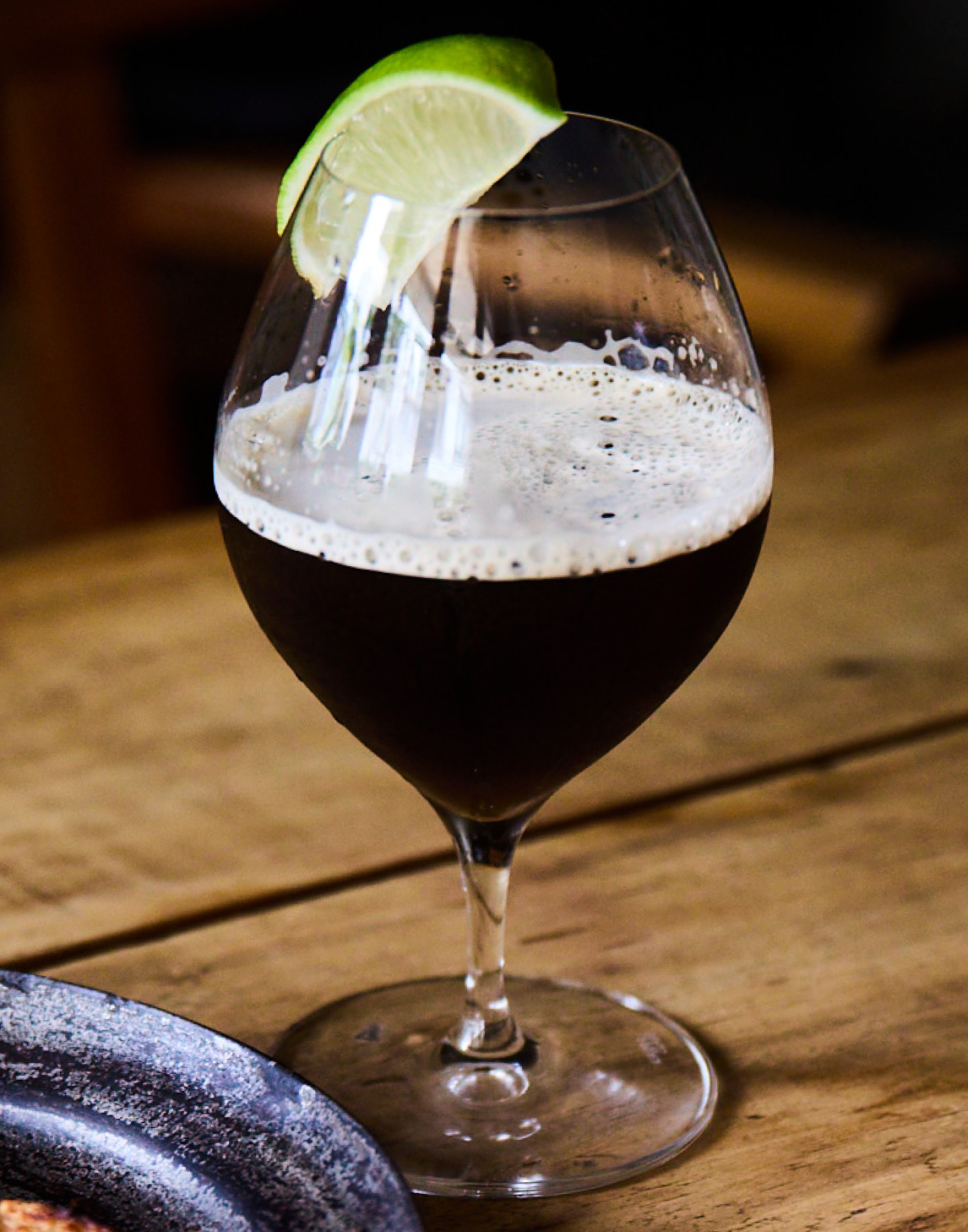 2 グラスにラムを注ぎ、りんごジュースを加えて軽くステアする。ギネスビールを加え、ライムを飾る。ライムを搾っていただく。