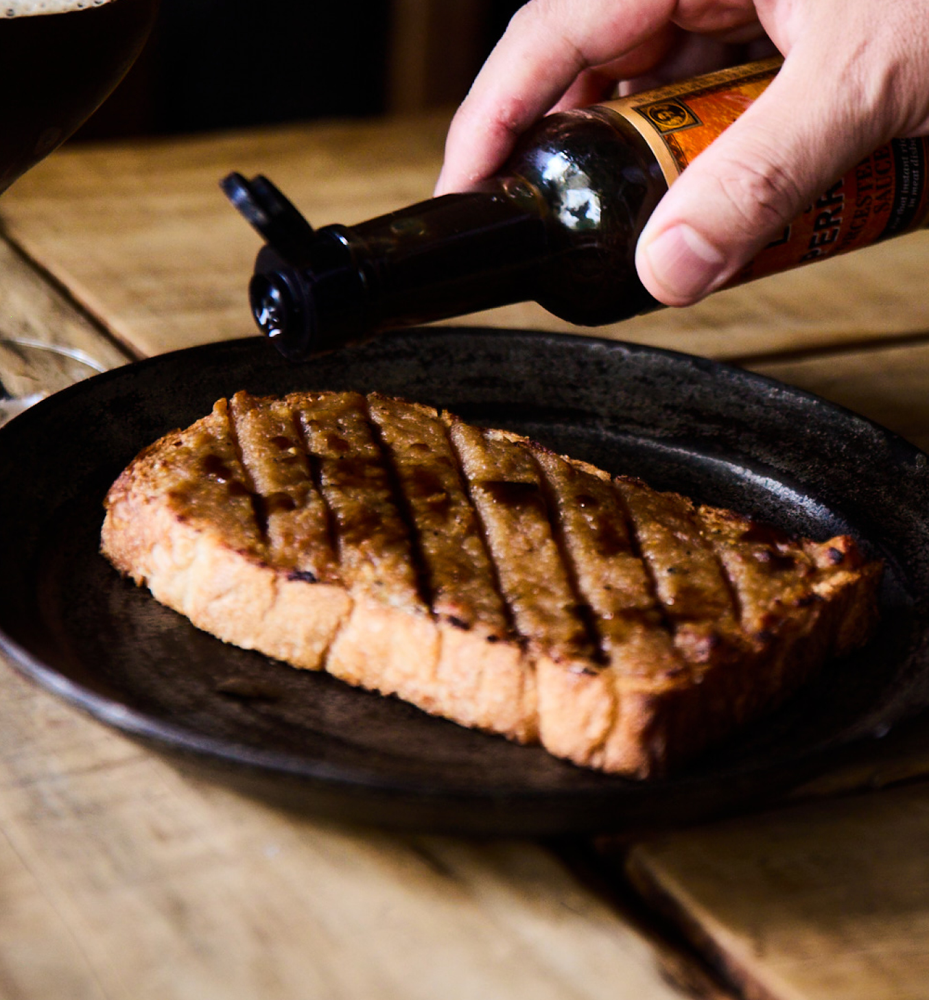 ③ 食パンにバターを塗ってからペーストを塗り、トースターでこんがりと焼く。焼き上がったら包丁で斜めに切り込みを入れ、食べる直前にリーペリンソースを回しかける。