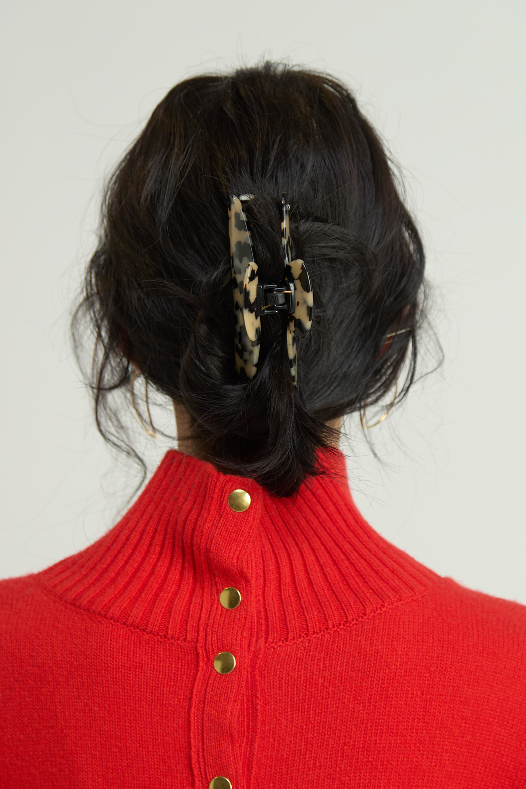 ファーのジャケットは首元にボリュームが出るので、髪はアップスタイルですっきりと。ただし無難にまとめるのではつまらない。抜け感をつくるには、一度ゴムでひとつに結んでから、ぐるぐるとねじりながら毛先が下になるように二つに折りたたみ、ヘアクリップやバレッタで固定します。後れ毛を引き出し、毛先にワックスなどをつけてニュアンスを出すのもお忘れなく。