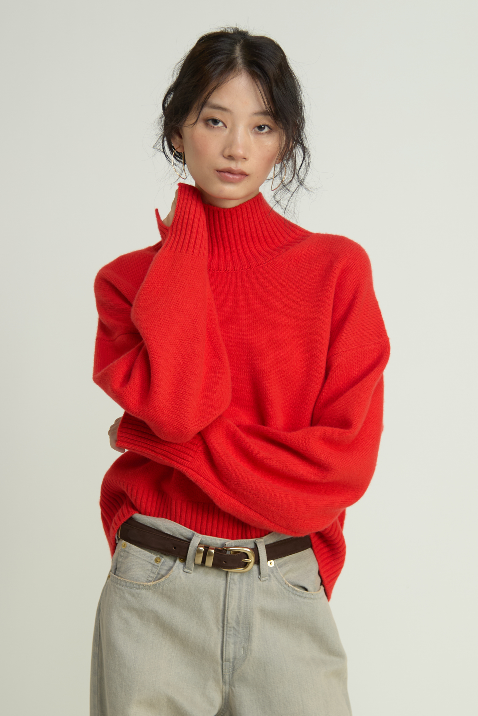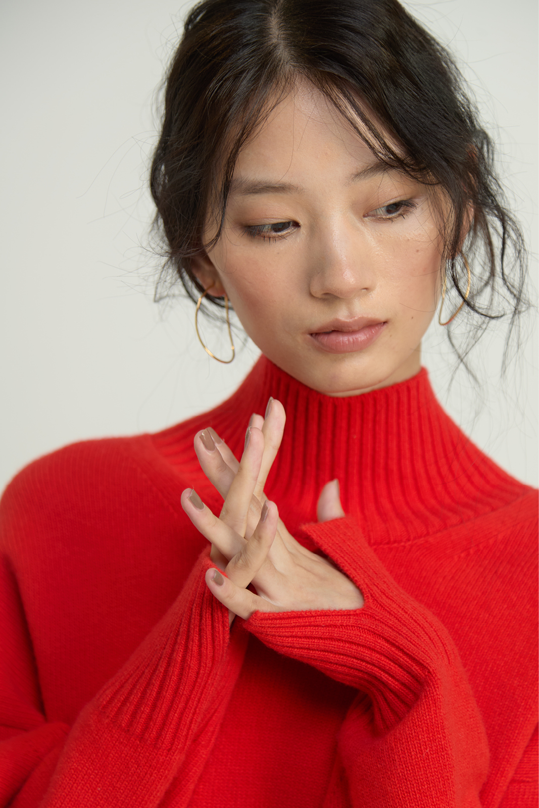 赤いニットが目を引くカジュアルなコーディネートは、ベージュのワントーンメイクでこなれた雰囲気に。