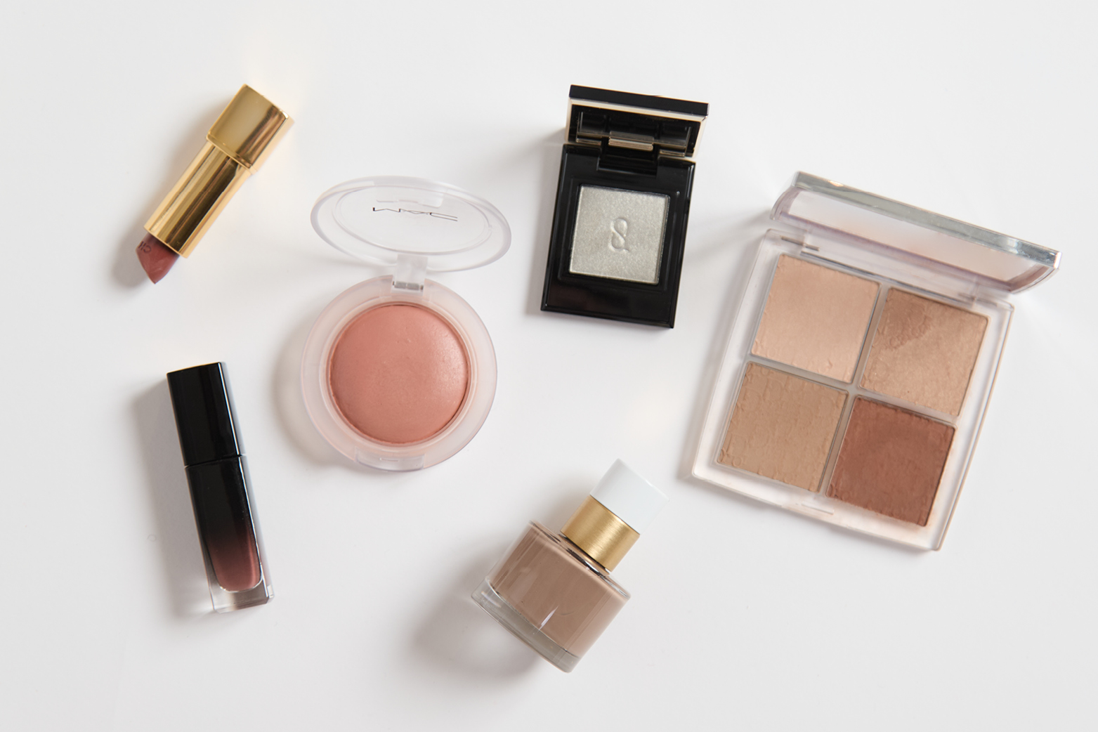 シマーなベージュのチークを頬と鼻先にのせて、かるく日焼けしたかのような血色をプラスすれば、老け見えする心配もなし。リップは全体にヌードベージュを塗ってから、赤みのあるベージュを唇の中央部分に重ねると、ふっくらと仕上がります。