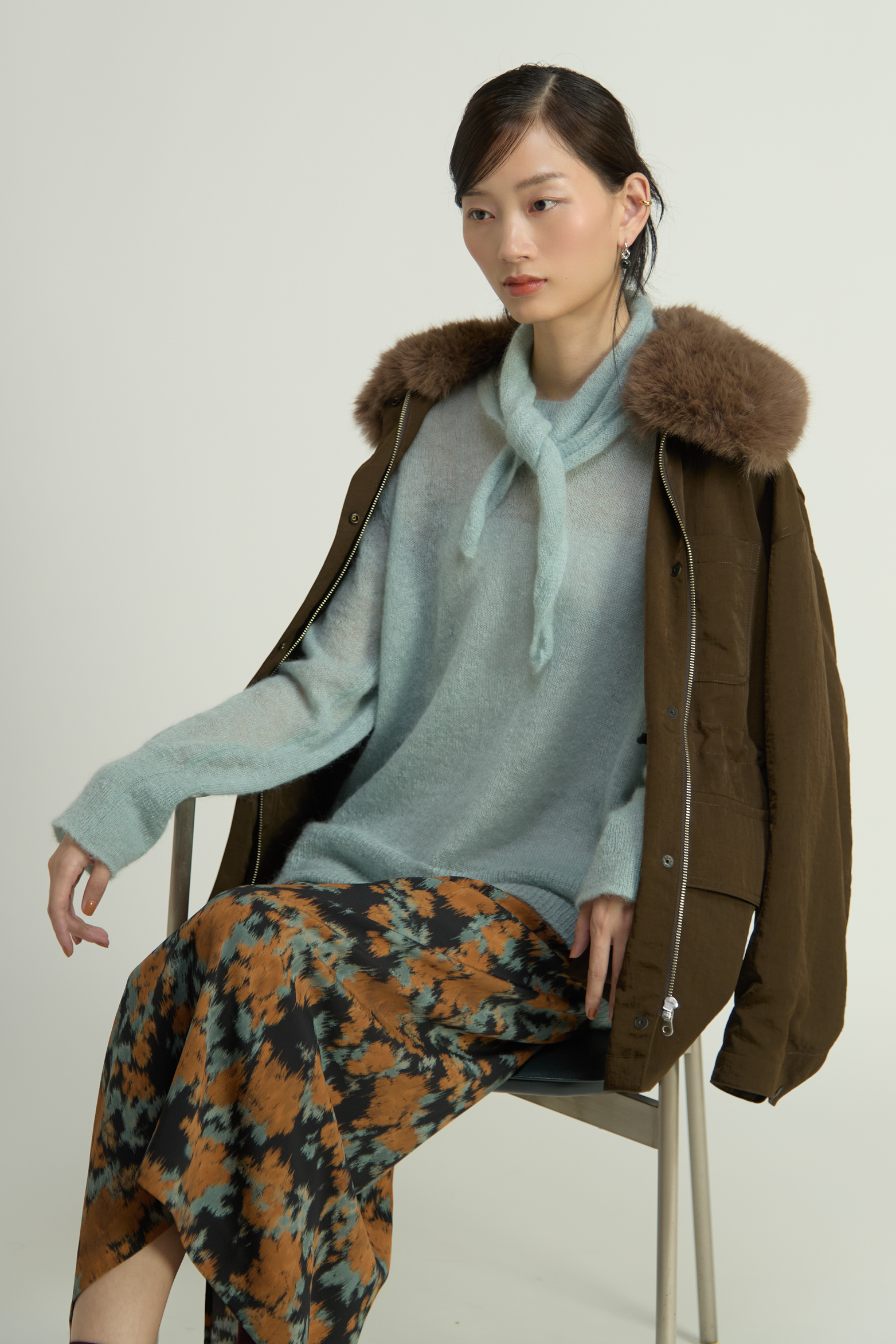 洋服に合わせてメイクを考えるとき、色をリンクさせるのもいいけれど、反対色を合わせて引き立てるのも素敵です。そこでこんなミントグリーンのモヘアニットには、明るいオレンジのアイシャドウをチョイス。流行りのピンクメイクよりも大人っぽく仕上がるし、秋冬のニュアンスを出しやすいはず。
