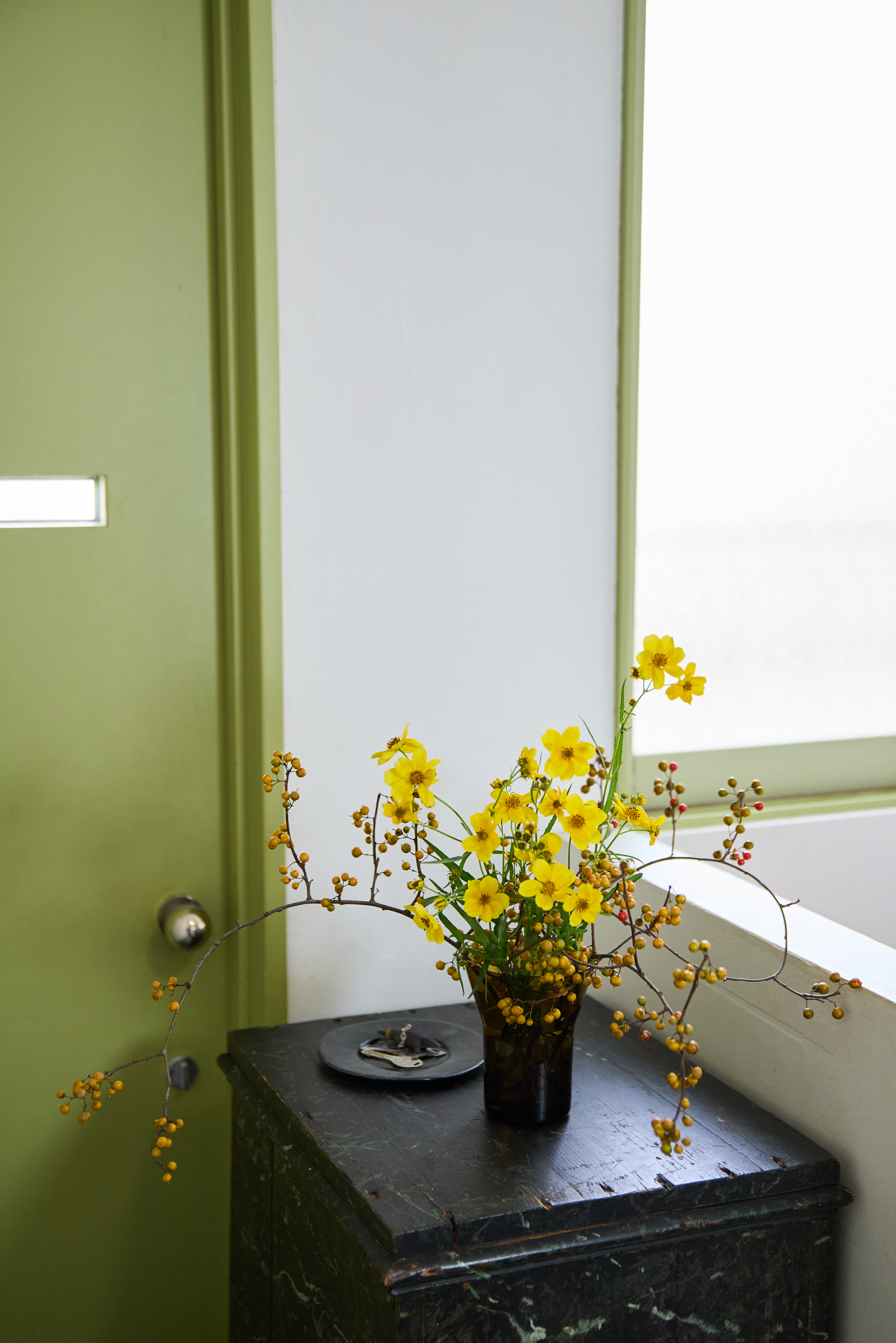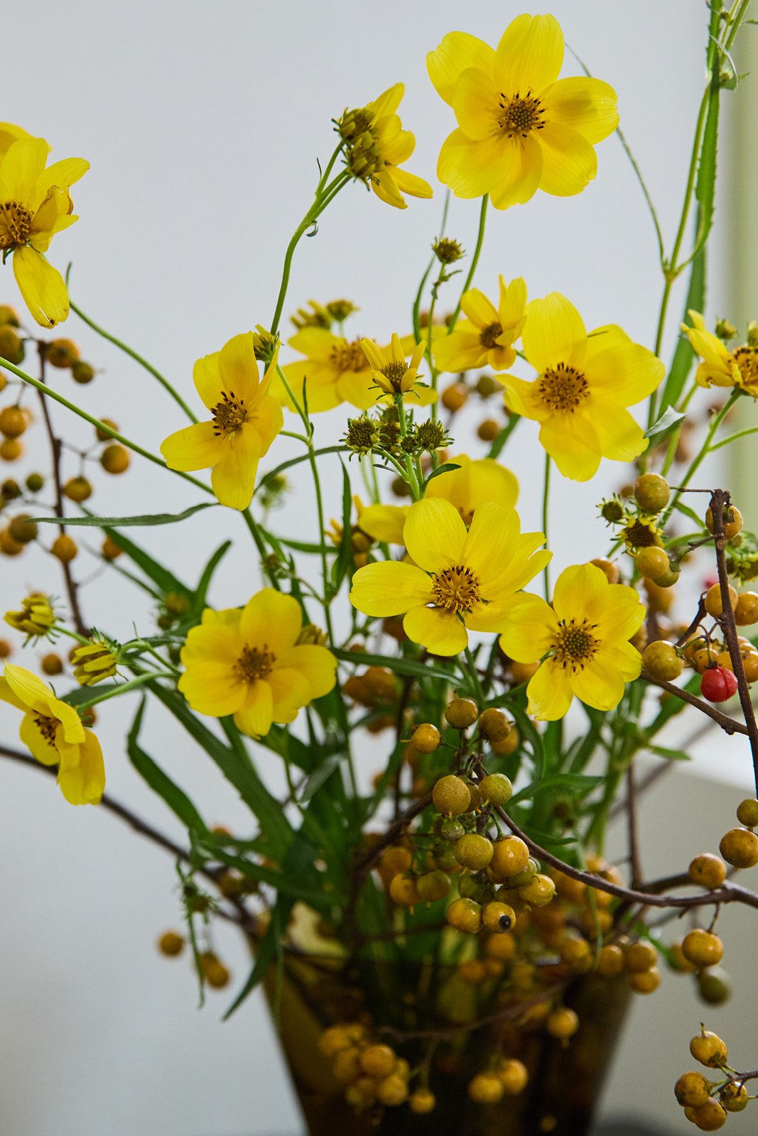 Kaj Franckデザインのガラスベースに合わせて選んだのは、同系色のツルウメモドキと、イエローオレンジのコスモス。ファッションと同様に、同系色は簡単にスタイリッシュに見せられるので、まずはワントーンで揃えてみるといいですよ。逆にイエロー×パープルのように補色で組み合わせるのも、お互いが際立って素敵です。