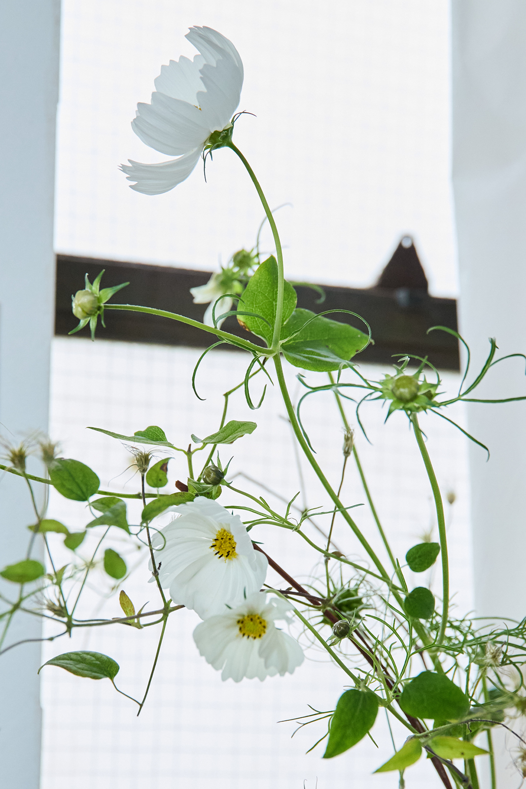 野草のようなニュアンスがあるクレマチスシードと白いコスモスで、ナチュラルにまとめました。