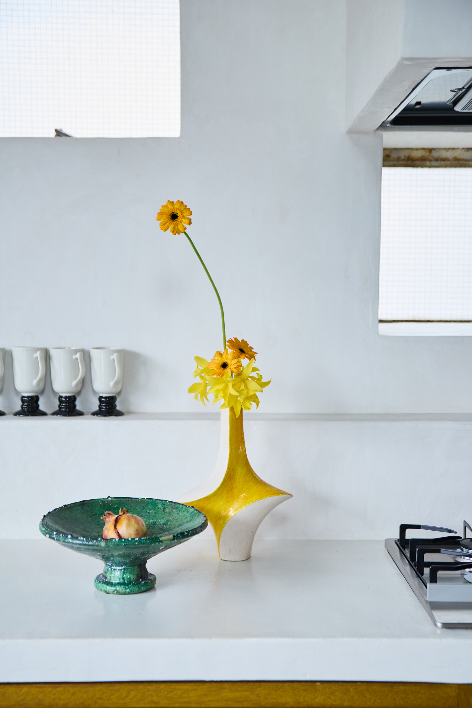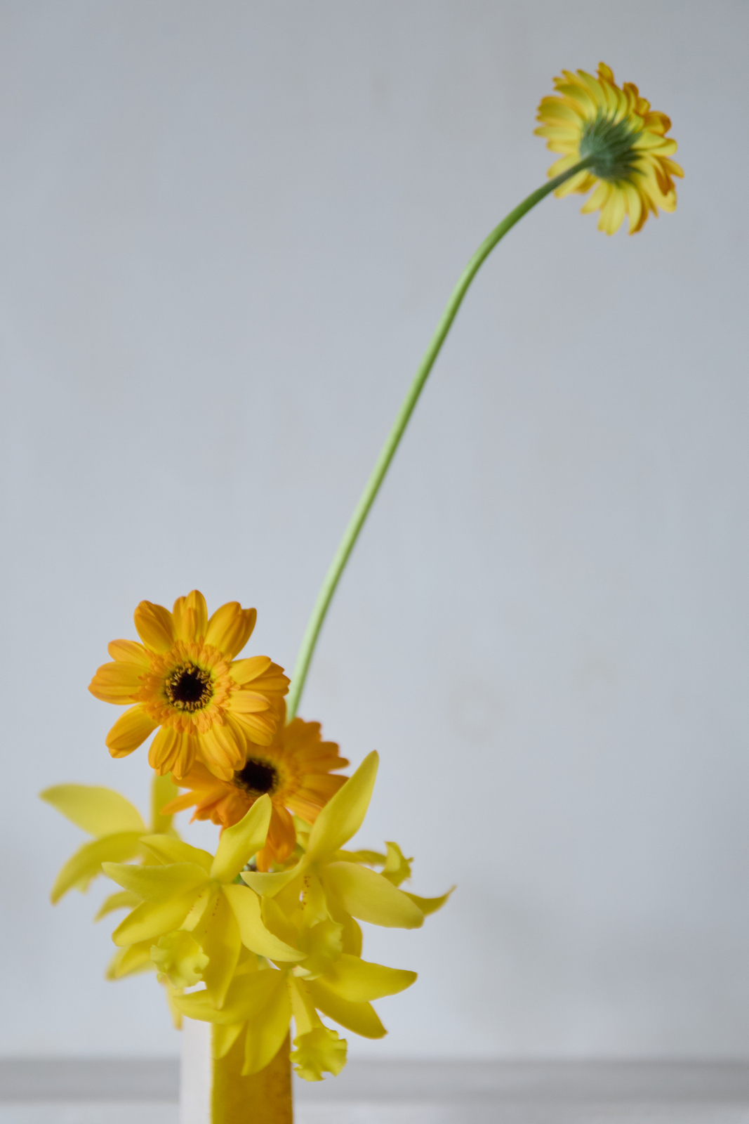 今日は明るい黄色のガーベラとシンビジウムを高低差をつけて生けることで、ポップなリズム感を演出しました。炊事作業の邪魔にならないよう、量は控えめにさりげなく。洗面所と同様に、水換えがしやすいのもうれしいところ。