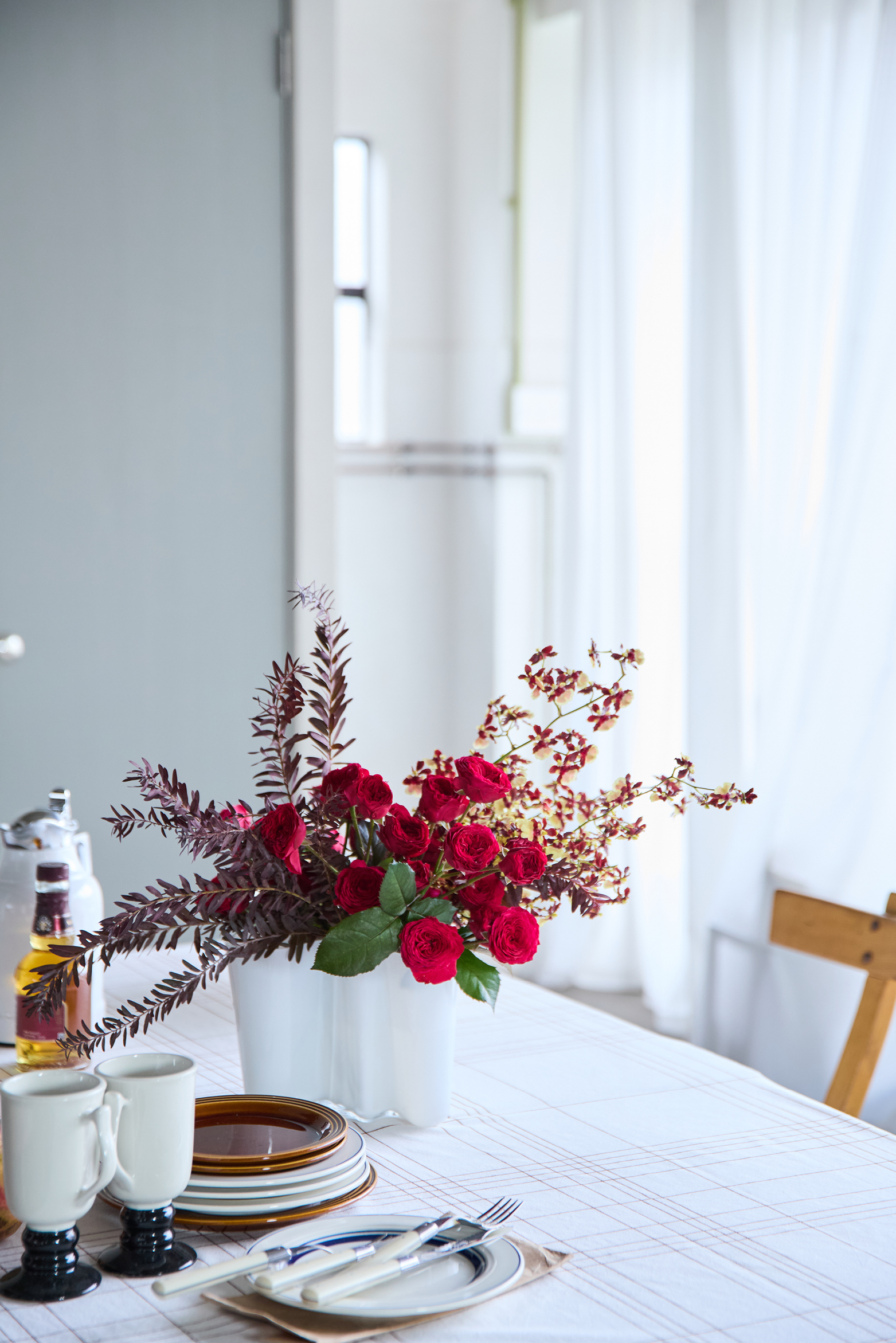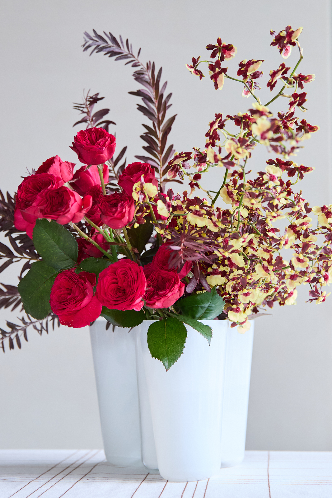 ボリュームを出したいときは、一本の茎から複数の花が枝分かれして咲くスプレー咲きのバラを選びましょう。これを先に生けてから、枝の隙間に赤く染めた枝もの(ブルーブッシュ)や、カプチーノという名前が可愛いオンシジウムを挿していき、全体のバランスを整えます。