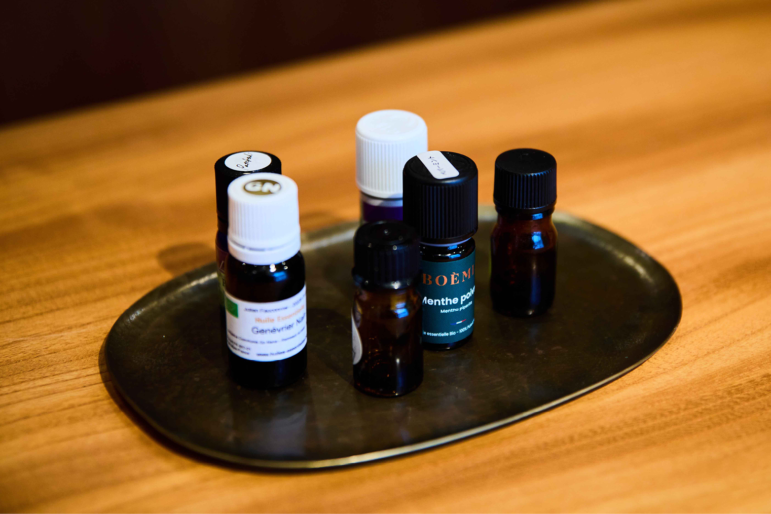 「緊張や不安でなかなか寝付けないのは、心配ごとで頭が冴えて覚醒している状態ではないでしょうか。特に真面目な人ほど、思考が止まらなくなりがち。心と体をグラウンディングさせるために、サンダルウッドやベチバーなど、樹木や根などからの安定感のある香りを提案します。『生理前にこうなりやすい』と自覚している“予期不安”も影響しているかもしれません。そんなときは、『これを嗅ぐと眠くなりやすい』というスイッチになるような香りをあらかじめ用意しておくのもひとつの方法です。