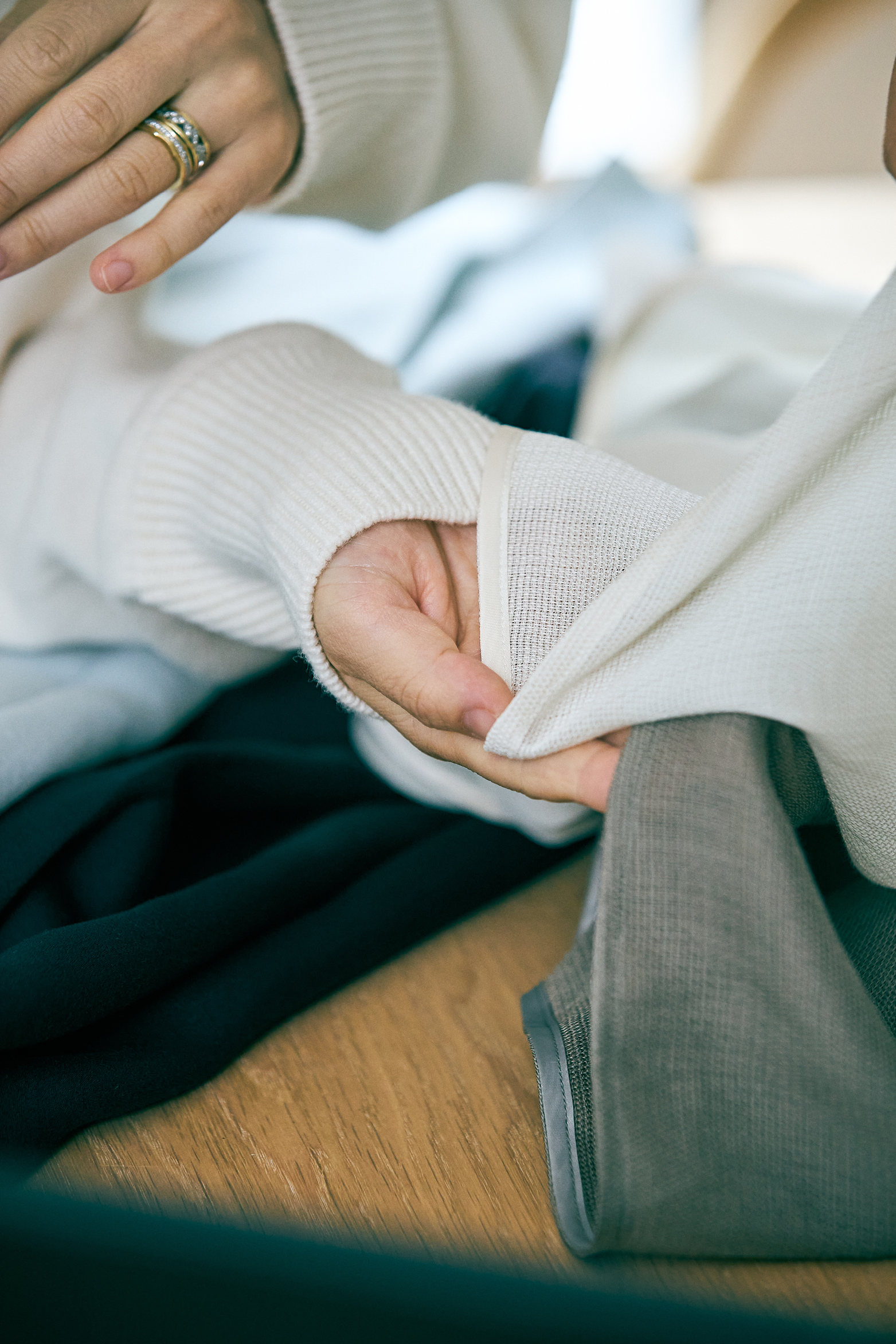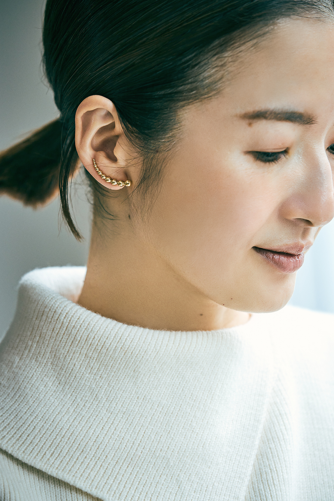 「以前はよく着けていたシルバーも、今の自分の肌にはゴールドがしっくりくる気がして。クローゼットを開けると黒、グレー、ベージュ……そこに最近はブラウンが加わって、色柄がほとんどなくなりました。子どもが生まれて自分にかけられる時間が減ったからこそ、迷わず理想のコーディネートが組める“選択肢の少なさ”が、今の私にはすごく大事なんです。単調に見えても、その上にゴールドのアクセサリーをひとつ添えると、ぐっと気持ちが上がるんですよね」
