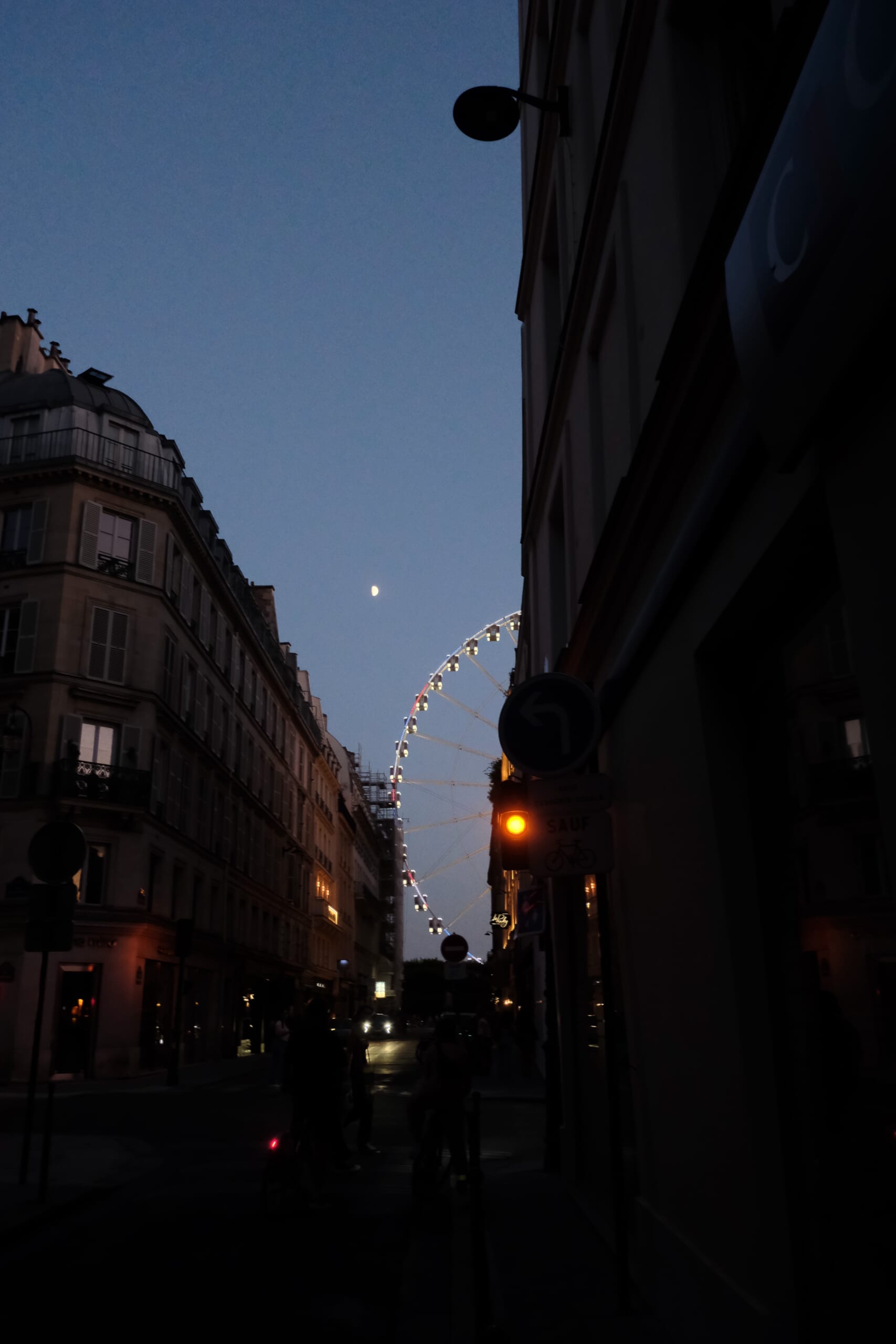 22時近くになっても薄明るい空のパリの夜、ディナーを満喫したあと、街並の隙間から突然現れた観覧車に引き寄せられるように夜散歩がスタート。