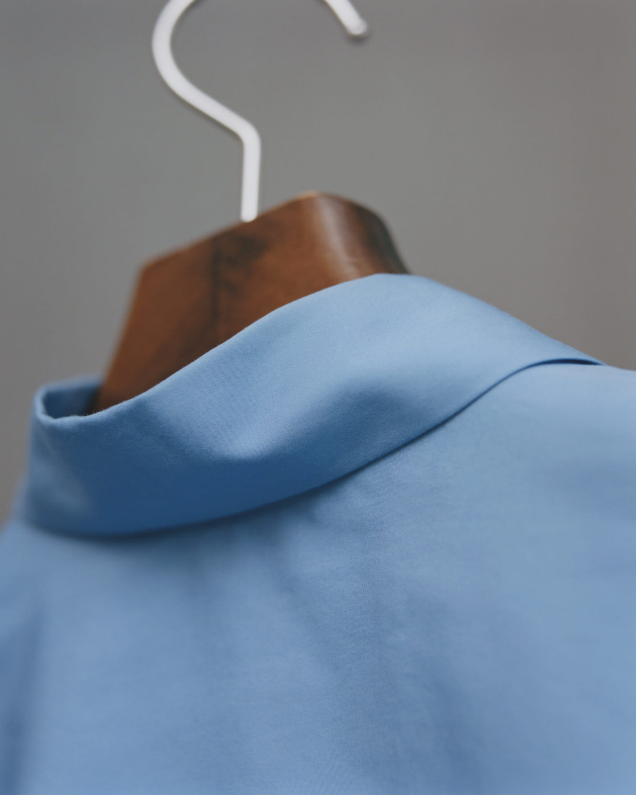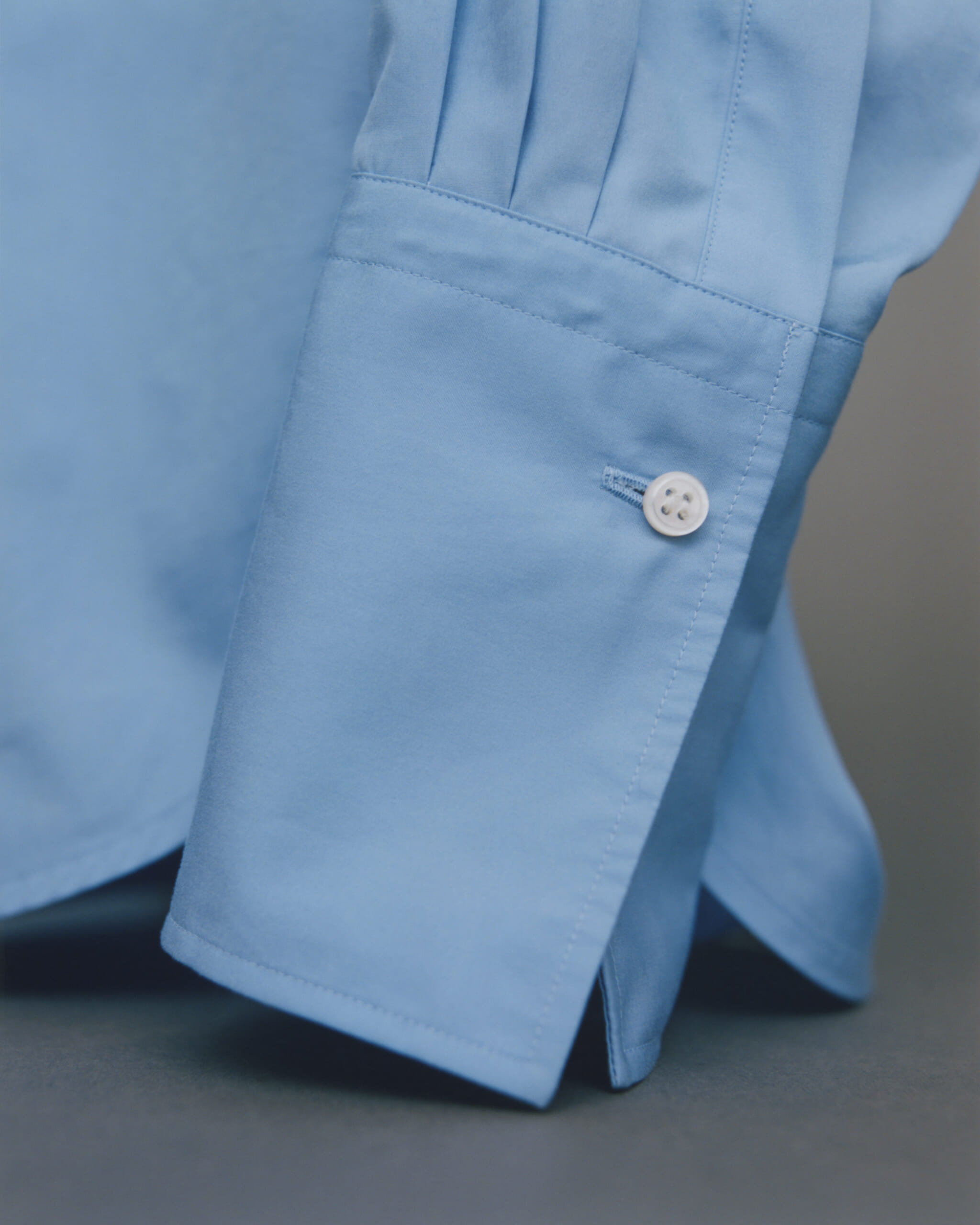 シャツ専門の工場にお願いして、剣ボロや縫い代の始末、裾のガゼット(脇に付ける補強布)まで、メンズシャツの仕立て方で縫製しています。裏側まで完璧に美しく、長めのカフスがドレスシャツのようでエレガント。ボウタイは片結びにしたり、広げて太くしたり、ちょっとネクタイのようなニュアンスを楽しんでいただけたら。