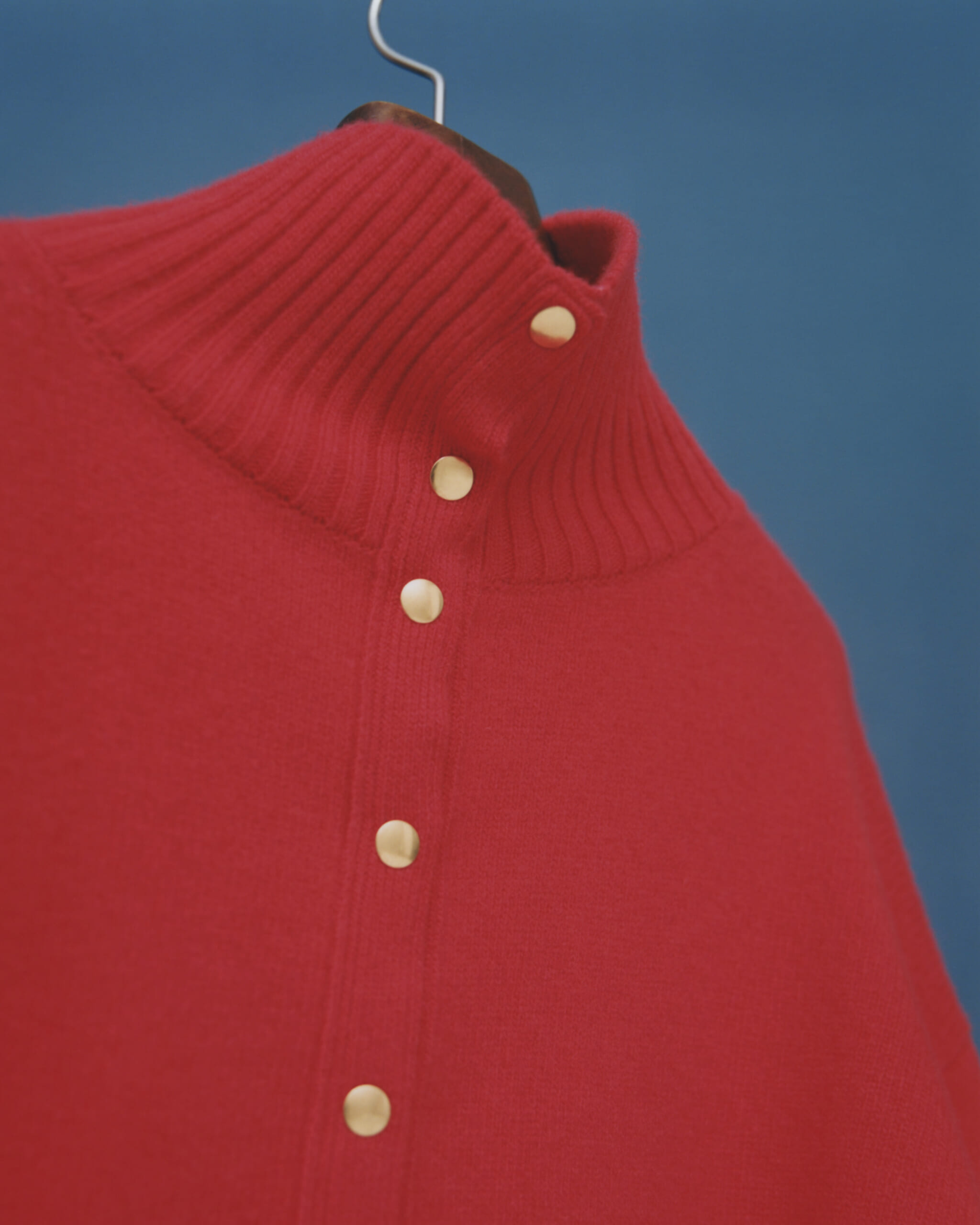 背中部分にドットボタンをあしらっているので、後ろ姿もチャーミング。前後どちらにも着られる2WAY仕様で、ボタンを前にして衿元を開ければ、セーラーカラーのような表情に。中にシャツを重ねたり、ハイネックカーディガンのように羽織ったり、裾のボタンをはずしてボリューミーなスカートを合わせたり。アレンジ次第で多彩なスタイリングを楽しめます。